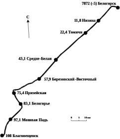 Участок Белогорск – Благовещенск имеет протяженность 108,1 км. Профиль пути участка резкоперевалистый, затяжных подъемов нет. На рисунке 1.1 представлен план участка.