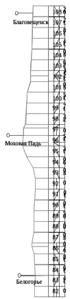 При движении поезда в четном направлении первоначально поезд преодолевает небольшой подъем, на котором самый крутой уклон (7,6 ‰) имеет участок протяженностью 900 м. Далее следует склон с максимальным уклоном -8 ‰ протяженностью 1000 м. Перед станцией Низина имеется подъем с максимальным уклоном 8,7 ‰ протяженностью 1100 м. Этот уклон является максимальным на всём участке Белогорск – Благовещенск. Между станциями Низина и Томичи имеются два небольших перевала с максимальным уклоном 8,3 ‰ протяженностью 1000 м. После станции Томичи перевалы уже имеют меньший уклон и на участке Томичи – Среднебелая максимальным уклоном является 8 ‰ протяженностью 900 м. Между станциями Среднебелая – Березовский-Восточный отсутствуют большие уклоны и в продольном профиле пути практически отсутствуют перевалы. На участке Березовский-Восточный – Призейская также практически отсутствуют резкие уклоны, за исключением окраин станции Призейская. Резкие уклоны при приближении к станции Призейская вызваны наличием моста через Зею. Далее от станции Призейская до Благовещенска резкие уклоны практически отсутствуют, за исключением приближения к станции Моховая падь, где железнодорожный путь пересекает возвышенность.