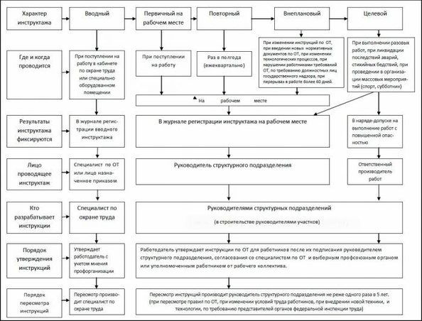 Основным в организации по охране труда является проведение инструктажей. Существуют водный инструктаж и инструктажи на рабочем месте, такие как первичный, повторный, целевой, внеплановый [16].