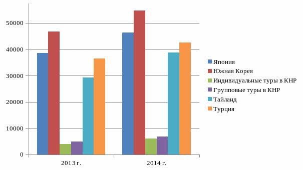 В 2014 г. цены на все выездные туры значительно увеличились. По итогам 2014 г. стоимость самого дорогого тура составила 54,7 тыс. руб. (чартерный рейс в Южную Корею), его стоимость увеличилась на 7,9 тыс. руб. по сравнению с 2013 г.