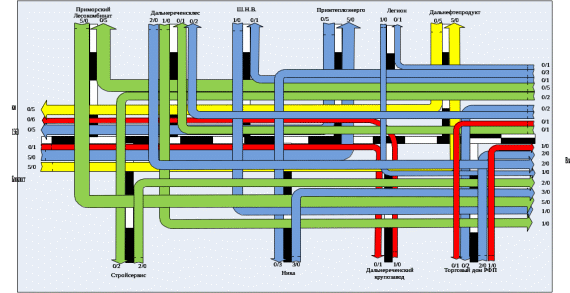 На основе балансовой таблицы строится диаграмма вагонопотоков (рис. 2.9). На диаграмме показывается прибытие и отправление груженых и порожних вагонов с распределением их по грузовым пунктам.