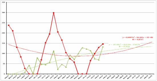 ис. 2.8. Диаграмма объемов выгрузки грузов на пути необщего пользования станции Дальнереченск I: - Примтеплоэнерго; - -Дальнефтепродукт; -линия тренда (Примтеплоэнерго); –линия тренда (Дальнефтепродукт) Линия тренда в наибольшей степени приближается к представленной на диаграмме зависимости, если значение