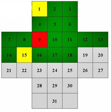 В основе системы лежит метод визуального контроля «Крест безопасности». Он так называется, потому что результаты ежедневного контроля заносятся в бланк «КСОТ-П», на котором представлены квадраты – дни месяца, расположенные в виде креста. Каждый квадрат разбит на две части, соответственно на две рабочие смены – день, ночь. Пример изображения креста безопасности изображен на рисунке 2.1