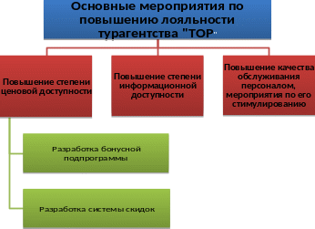 Удовлетворение абсолютно всех потребностей туристов — это крайне сложная и практически невыполнимая задача, поскольку все клиенты обладают индивидуальным набором запросов и интересов. [44] В то же время планомерное и целенаправленное проведение заранее продуманных мероприятий, направленных на повышение качества обслуживания, позволяет повысить степень удовлетворенности людей, обратившихся в турфирму. С учетом конкурентоспособности туристической компании «Тор», предлагается создание программы лояльности по ряду направлений (рис. 3.1).