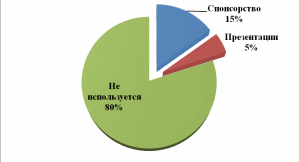 Исследование также показало, что PRкак средство продвижения в 80 % ресторанов от общей совокупности не применяется. Проведение презентаций организовывалось лишь в двух ресторанах(5%), спонсорством занимаются 6 предприятий из рассмотренных в процентном отношении это 15% (рис 2.5).