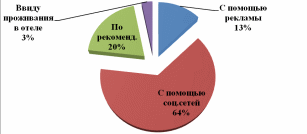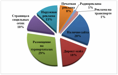 Как показало исследование (рис.2.3),1/3 ресторанов, используют информирование гостей с помощью туристических онлайн порталов, сайтов, социальных сетей, то есть в целом интернет-продвижение занимает 60% от совокупности всех используемых инструментов продвижения. Также можно описать такой способ воздействия на потребителей, как direct-мэйл (который является методом прямого или direct-маркетинга), процент его использования составляет 18%. Наряду с этим, традиционные средства рекламирования используют 23% предприятий, что составляет самую малую долю(
