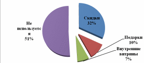 Затем были рассмотрены способы воздействия посредством стимулирования сбыта. Исследование показало, что более половины респондентов (51%) не используют методы стимулирования сбыта, и 32% (13 предприятий) применяют скидки в качестве привлечения гостей, наименьшее количество предприятий устанавливают внутренние витрины(рис.2.4).