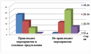 Привлекательность мероприятий и сезонных предложений, периодически проходящих в ресторане, по достоинству оценивают участники группы 18-24 лет. В самой меньшей степени это привлекает группу от 55 лет. Не пользуются популярностью подобные мероприятия среди респондентов 35-54 лет(рис. 2.15).