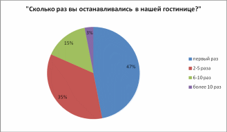 На второй вопрос «Сколько раз вы были в нашей гостинице?» были даны следующие ответы: первый раз- 46 (47%), 2-5 раза – 34 (35%), 6-10 раз- 15 (15%), более 10 раз- 5 (3%)
