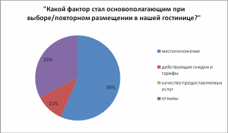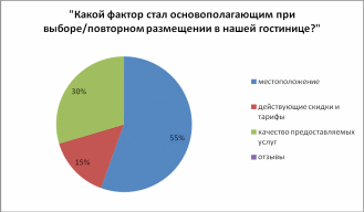 Были выявлены факторы, которые в большей степени повлияли на выбор и повторное размещение в гостинице. Так, 30 (55%) участников анкетирования из 54 опрошенных, которые разместились в гостинице повторно, указали местоположение гостиницы, как основополагающий фактор при повторном размещении в гостинице, только 8 (15%) опрошенных указали «действующие скидки и тарифы», и 16 (30%) опрошенных выбрали «качество предоставляемых услуг».