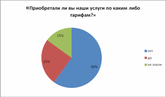 На вопрос «Приобретали ли вы наши услуги по каким либо тарифам?» 60% анкетируемых ответили отрицательно, 15% не знали о наличии тарифов и 25% пользовались тарифами.