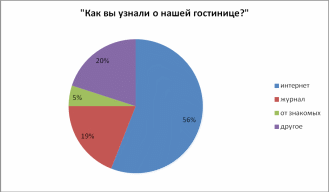 На вопрос «Как вы узнали о нашей гостинице?» респонденты дали следующие ответы: через интернет – 56 (56%), журнал -19 (19%), от знакомых- 5 (5%), другое- 20 (20%)