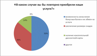 На вопрос «В каком случае вы бы повторно приобрели наши услуги?» 50 (50%) респондентов указали, что возможность начисления бонусных баллов и их обмен на услуги, привлекли бы их к повторному приобретению услуги сильнее чем наличие накопительной дисконтной карты или увеличение размера скидок. 36% респондентов выбрали ответ «увеличение размера скидок, а 14% выбрали наличие накопительной дисконтной карты.