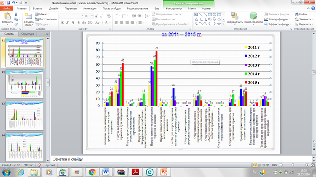 и системного изучения и измерения степени воздействия факторов на величину результативных показателей работы эксплуатационного депо и локомотивного хозяйства в целом – факторный анализ. На основе экспертной обработки архива статистической информации о нарушениях, выявленных при расшифровке скоростемерных лент и электронных носителей информации, имевших место в 2011 – 2015 годах, было определено влияние каждого из факторов на возникновение транспортных происшествий и событий того или иного вида по вине работников депо. В данном случае ставится задача по определению уровня влияния факторов безопасность движения и уровня влияния факторов, при котором создаётся угроза возникновения транспортного происшествия или события, а для их предупреждения требуется принятие неотложных мер. Устанавливаются границы изменения величины индекса