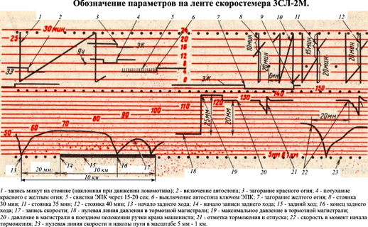 1 – запись минут на стоянке (наклонная при движении локомотива); 2 – включение автостопа; 3 – загорание красного огня; 4 – патухание красного огня; 5 – свистки эпк через 15-20 секунд; 6 – выключение автостопа ключём ЭПК; 7 – загорание желтого огня; 8,9,10,11, 12 – стоянка 30-40 минут; 13 – начало заднего хода; 14 – начало записи заднего хода; 15 – задний ход;16 – конец заднего хода; 17 – запись скорости; 18 – нулевая линия давления в тормозной магистрали; 19 – максимальное даление в тормозной магистрали; 20 – давление в тормозной магистрали в поездном положении ручки крана машиниста; 21 – отметка торможения и отпуска; 22 – скорость в момент начала торможения; 23 – нулевая линия скорости и наколы пути в масштабе 5 мм – 1 км.