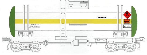 Так же на цистерну наносятся основной знак опасности - красный ромб с черным(белым) пламенем, с указанием на ЛВЖ и класс опасности-3; код опасности - 33 и номер ООН соответствующего вещества – 1203 в прямоугольной табличке; и ниже номер аварийной карточки – АК 305.