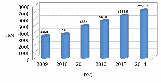 в 2014 году 7251 ткм (рост по сравнению с 2013 годом на 12,7%);