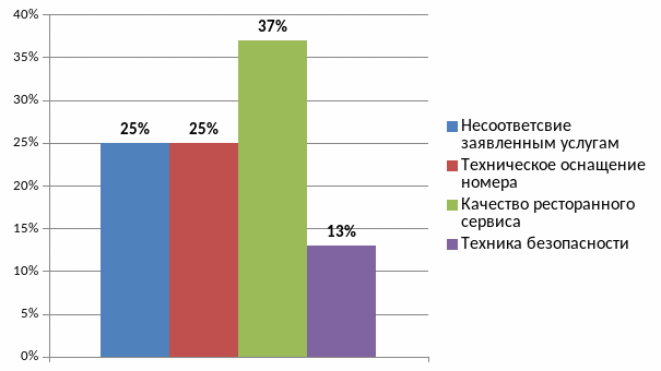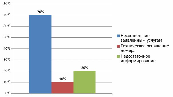Претензии были выделены по характеру. К несоответствию услугам отнесены заявленные в программе украшение номера и десерт с шампанским в номер, так же бронирование одного номера, и по приезду – заселение в другой. К техническому оснащению – расположение номера, звукоизоляция, температура. К информированию – возможность позднего выезда.