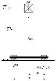 W1…Wn− давление ветра на отдельные части конструкции крана, Н; G1− вес портала, Н; G2 − вес тележки и грузового полиспаста, Н; G3− вес противовеса на одной тележке, Н; a,в,c,h1,h2−плечи сил относительно точки опрокидывания 0, м.