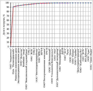 Для расчета среднесуточных вагонопотоков выбраны 10 путей необщего пользования и три пути общего пользования на основании таблице 2.2, имеющие наибольшую долю в объемах погрузки, выгрузки (рис. 2.3):
