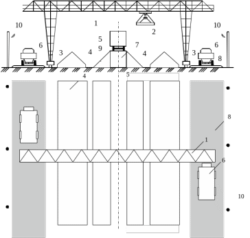 Рис. 3.1. Транспортно-грузовой комплекс по переработке лома черных металлов козловым краном: 1 – козловой кран; 2 – грейфер; 3 – подкрановый путь; 4 – штабель; 5 – вагон; 6 – автомобиль; 7 – повышенный путь; 8 – дорога; 9 – железнодорожный путь; 10 – прожектор