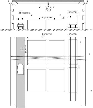 Рис. 3.2. Транспортно-грузовой комплекс для перегрузки металлопродукции (пакетами) с использованием мостового крана: 1 – вагон; 2 – мостовой кран; 3 – штабеля груза; 4 – автомобиль; 5 – грузозахватное устройство; 6 – автомобильная дорога; 7 – железнодорожный путь; 8 – переработка металла через склад; I участок – выгрузка металлопродукции из вагона; II – зона хранения металлопродукции; III участок – погрузка металлопродукции на автомобиль