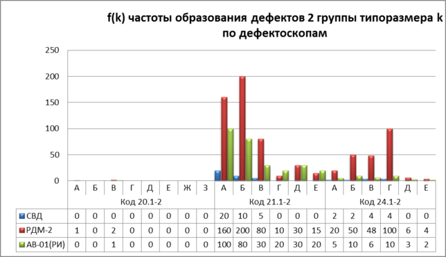 | Код дефекта | Типоразмер | f(k) частоты образования дефектов типоразмера k по дефектоскопам | ||