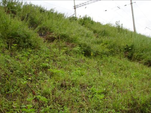 В ходе осмотра установлено следующее: данный двухпутный участок железной дороги находится в кривой радиусом 380 м. На момент осмотра состояние рельсовой колеи стабильно. Земляное полотно представлено насыпью высотой до 11,3 м, со стороны нечетного пути обочина отсутствует, балластный шлейф, сложенный щебнем, пескогравием и засорителем балласта мощностью около 2/3 высоты насыпи. Откос имеет непрямолинейное очертание, в верхней части крутизна его завышена. На поверхности откоса наблюдаются местные оплывы грунта, трещины и стенки отрыва (рис. 4.1).