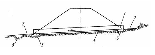 1 - подушка основания; 2 - укрепление откоса; 3 - противофильтрационный экран; 4 - портальная стенка