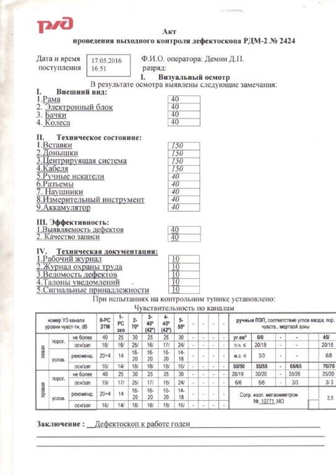 Все Акты заполняются от руки. По результатам проведения ТО в Акте за подписью мастера участка диагностики, наладчика, расшифровщика и старшего оператора делается заключение о годности / не годности (путем зачеркивания не требуемого словосочетания) дефектоскопа с регистратором, дефектоскопа ВК к дальнейшей эксплуатации.
