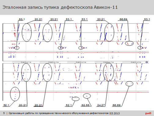 На каждый тип дефектоскопа с регистратором, дефектоскопа ВК оформляется по форме Приложения №2 «Схема расположения дефектов на контрольном тупике» с образцовой дефектограммой проверки работоспособности дефектоскопа как в прямом, так и в обратном направлении на всем протяжении контрольного тупика и выявляемости каждого дефекта на контрольном тупике, подлежащего выявлению данным типом дефектоскопа с учетом конструктивных особенностей дефектоскопа и укладки контрольного тупика, далее – образцовая дефектограмма проверки работоспособности. Образцовые дефектограммы проверки работоспособности по каждому типу используемых в дистанции пути дефектоскопов распечатываются в формате А3 или более крупном, утверждаются и вывешиваются над контрольным тупиком.