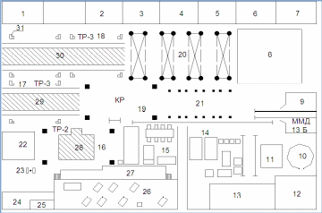 1. Участок экипировки; 2. Ремонт автотормозного оборудования; 3. Заготовительный участок; 4. Мелкослесарное отделение; 5. Ремонт секий холодильника, топливоподогревателей, теплообменников; 6. Ремонт фильтров; 7. Компрессорная; 8. Станция обкатки гидропередач СГ-11; 9. Мойка ММД-13Б; 10. Мойка круглая; 11. Обкатка редукторов и колёсных пар; 12. Сварочное отделение; 13. Отделение ремонта гидропередач; 14. Экипажное отделение; 15. Отделение ремонта карданных валов; 16,17,18,19. Участок разборки тепловоза; 20. Участок разборки холодильника; 21. Участок разборки рам тележек тепловоза; 22. Участок опрессовки и испытания автотормозного оборудования; 23. Курительное помещение; 24. Электроаппаратная; 25. Покрасочная; 26. Механическое отделение; 27. Сборочное отделение; 28,29,30. Сливные ямы; 31. Домкрат для поднятия тепловоза.