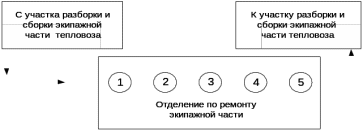1 – разборка тележки; 2 – мойка ММД- 13Б; 3- разборка, сборка осевых редукторов; 4 – разборка рамы тележки; 5 – разборка рессорного подвешивания; 6 – разборка, сборка карданных валов; 7 – колёсно – роликовый участок.