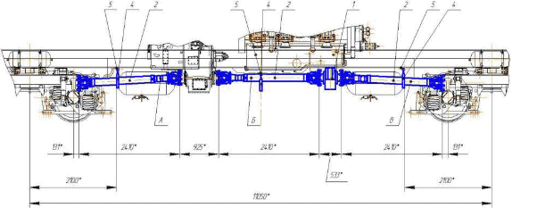 На рисунке 5.1 видим, что передача крутящего момента от выходного вала гидропередачи ко второму осевому редуктору первой тележки тепловоза происходит через раздаточный карданный вал длинной 2410 мм, а от второго к первому осевому редуктору через тележечный карданный вал.