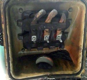 При проверке коробок выводов следует обращать внимание на подгары и выжиги рядом с проводами. На рисунке 3.2 представлены две коробки выводов, слева коробка без дефектов, справа с дефектами.
