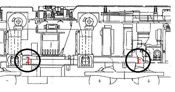 Рисунок 5.4 – Схема перемещения пусковых конденсаторов на электровозе 3ЭС5К: 1 – стандартное размещение пусковых конденсаторов, 2 – предложенное размещение пусковых конденсаторов