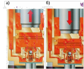 При растяжении гасителя (рисунок 1.7, а), поршень поднимается вверх, увеличивая давление масла над собой, и масло через перепускной клапан в поршне узкими щелевыми каналами перетекает под поршень, образуя жидкостное трение, и движение поршня замедляется.