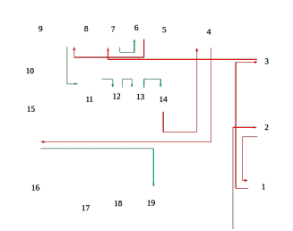 На рисунке приведен план цеха по ремонту гидравлических гасителей колебаний в сервисном локомотивном депо «Дальневосточное». Как видно из рисунка, цех имеет неудачное расположение верстаков и оборудования, что приводит к лишним перемещениям ремонтируемых агрегатов, а значит и потерям рабочего времени. Кроме того, ввиду того, что в цехе одновременно работают 2-3 слесаря, возможна вероятность пересечение траекторий движения работников, которые будут мешать друг другу. Красными стрелками на рисунке обозначены перемещения, которые следует оптимизировать за счет изменения общей планировки цеха. Зелеными обозначены относительно удачные траектории, которые не требуют оптимизации.