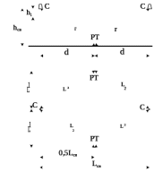 Рисунок 6.1 – Схема к расчету искусственной освещенности точечным методом: hсв – высота подвеса светильника С; h1 – высота расположения светильника над условной горизонтальной поверхностью; r – расстояние от светильника до расчетной точки РТ; d – расстояние по горизонтали от проекции оси светильника до расчетной точки; L1 – расстояние от проекции оси светильника до расчетной оси освещаемого объекта; L2 – расстояние от проекции оси светильника до расчетной точки; Lсв – расстояние между светильниками
