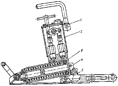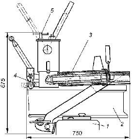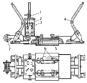 1 – двухплунжерный насос; 2 – резервуар с маслом; 3 – шток; 4 – трёхступенчатый рельсовый захват; 5 – опорное устройство