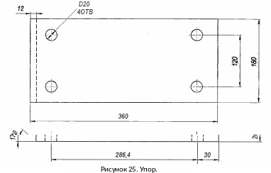 Все вышеуказанные размеры приняты конструктивно исходя из габаритных размеров путевого гидравлического инструмента, швеллера, рельса Р65. На неподвижной раме стенда, к верхнему швеллеру пальцами крепится рельсовая рубка. При испытании рихтовщика, вместо рельсовой рубки устанавливается упор, для его стопорения при испытании. Упор изображен на рисунке 25. Диаметры отверстий и размеры упора приняты с учетом размеров рихтовщика и его усилий при работе. Соответственно и отверстия в швеллере сверлятся такие же, как и на упоре.