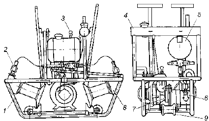 1 – рама; 2 – изоляция рамы от цилиндров; 3 – регулятор давления; 4 – топливный бак; 5 – масляный бак; 6 – насос; 7 – двигатель; 8 – гидравлический цилиндр; 9 – ролик для перемещения по рельсу.