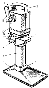 1 – пробка с отверстием (сапун); 2 – ручка для переноски домкрата; 3 – несъёмное приспособление для рихтовки; 4 – грузоподъёмная лапа; 5 – опорная плита; 6 – цилиндр; 7 – стопорный винт; 8 – спускной вентиль; 9 – клапанная коробка; 10 – резервуар для масла; 11 – рукоятка насоса (съёмный стержень не показан)