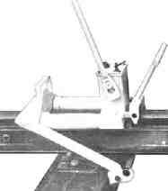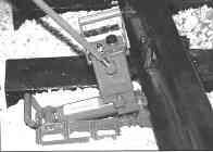 Ручной гидравлический рихтовщик ГР-12Б (рис. 3) устанавливается так, чтобы упор гидравлического толкателя упирался в подошву рельса. Отрывка балласта в шпальных ящиках или рыхление его у торцов шпал не требуется. Опорное устройство обеспечивает сцепление с балластом. При перемещении рукоятки сошник и передний конец стойки заглубляется в балласт, путь вывешивается на небольшую высоту и перемещается в поперечном направлении.
