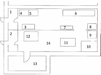 1 - склад с оборудованием в ремонт; 2 - склад с готовой продукцией; 3 -участок разборки гидравлического путевого инструмента; 4 - участок поверхностной мойки; 5 - участок ультразвуковой мойки; 6 - участок дифектовки; 7 - стеллаж с оборудованием в ремонт; 8 - стеллаж с инструментом в утилизацию; 9 - участок ремонта гидравлического путевого инструмента; 10 - кузнечный цех; 11 - участок сборки гидравлического путевого инструмента; 12 - универсальный стенд для настройки и испытания гидравлического путевого инструмента; 13 - покрасочная комната; 14 -мостовой кран.