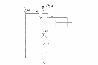 Вентили В1 и В2 необходимы для стравливания воздуха из гидросистемы при заправке; вентиль ВЗ - при заправке гидроаккумулятора газом. Обратный клапан необходим для предотвращения попадания жидкости из аккумулятора в гидроцилиндр при испытании.