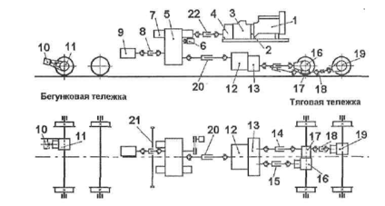 Измерение длины пройденного пути во время работы производится мерным катком 10 с датчиком. Один оборот катка соответствует 1 м пройденного пути. Привод машины в транспортном режиме осуществляется через силовую передачу (трансмиссию), структура которой отражена на рис. 1.2, а в рабочем - через силовую передачу и объемный гидропривод. Необходимая плавность разгона машины при ее транспортировке своим ходом достигается возможностью реализовать 16 ступеней передач при движении вперед и движении назад. В рабочем режиме привод на колесные пары тяговой и одну пару бегунковой тележки, осуществляется через гидромоторы 9, 10. Насосы установлены на реверс-раздаточной коробке 5, которая обеспечивает переключение рабочего и транспортного режимов и реверсирование движения в транспортном режиме.