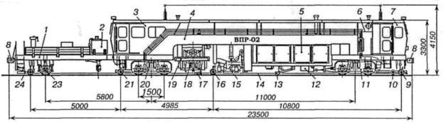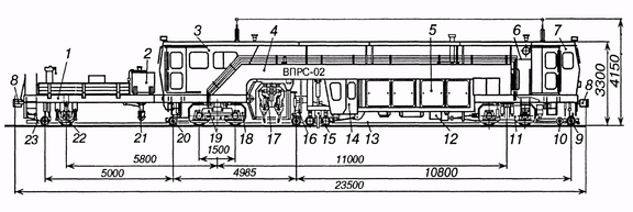 Машина ВПРС-02 (рисунок 3) выправляет путь в продольном профиле, по уровню и в плане, уплотняет балласт под шпалами и в зонах у торцов шпал, универсальная цикличного действия, одновременно или независимо выправляет продольный профиль, рихтует и подбивает путь на перегонах и станционных путях, на стрелочных переводах и пересечениях пути. По многим узлам и системам управления машина унифицирована с машиной ВПР-02. Унификация касается, прежде всего, экипажной части. Рама 4 имеет аналогичную конструкцию, но по сравнению с ВПР-02 более широкая, обеспечивающая необходимые поперечные смешения подбивочных блоков 17. Полностью унифицирована ходовая часть: тяговая 11 и бегунковая 18 тележки, дизельный агрегат 5 и силовая передача 12, тормозное оборудование, полуприцепная платформа 1.