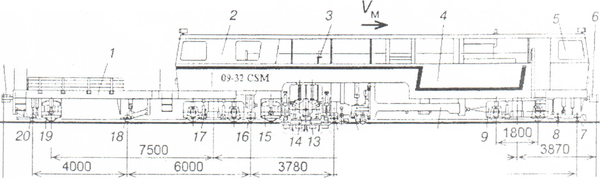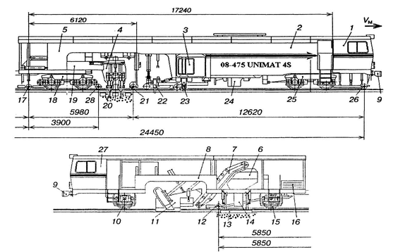 Универсальная машина 08-475 Unimat 4S представляет собой постоянно сцепленный экипаж, состоящий из основной машины 5 (рисунок 5) и дополнительного вагона 8. Аналогично всем машинам класса ВПР на основной машине под капотом 2 расположен дизельный агрегат мощностью 348 кВт, связанный через трансмиссию 24 с приводными колесными парами двухосной тяговой тележки 25. В рабочем режиме дизельный агрегат через силовую передачу передает мощность на гидронасосы, приводящие рабочие органы и механизмы передвижения машины. Дополнительный привод от гидромоторов в рабочем режиме осуществляется также на колесные пары двухосной бегунковой тележки 18. Дополнительный вагон опирается на переднюю 15 и заднюю 10 колесные пары. Машина оснащена автосцепками 9, тормозной системой, сигнальными устройствами и др.