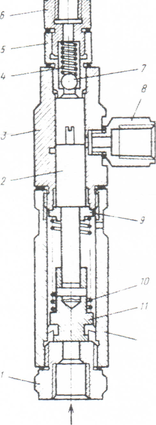 1,5,б,8-штуцеры; 2-плунжер; 3,12-гильзы; 4,10-пружины; 7-шарик: 9-шайба: l1-поршень